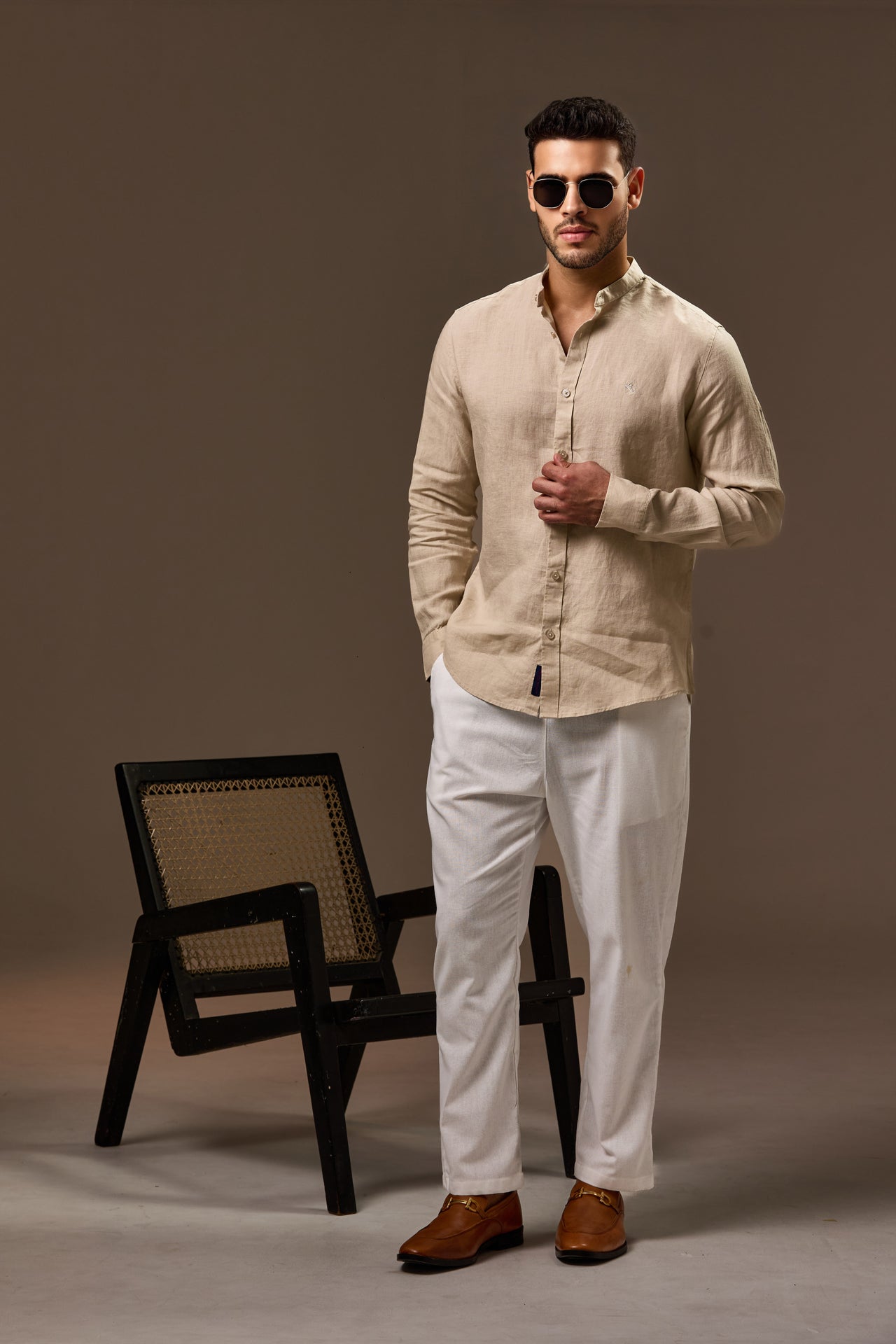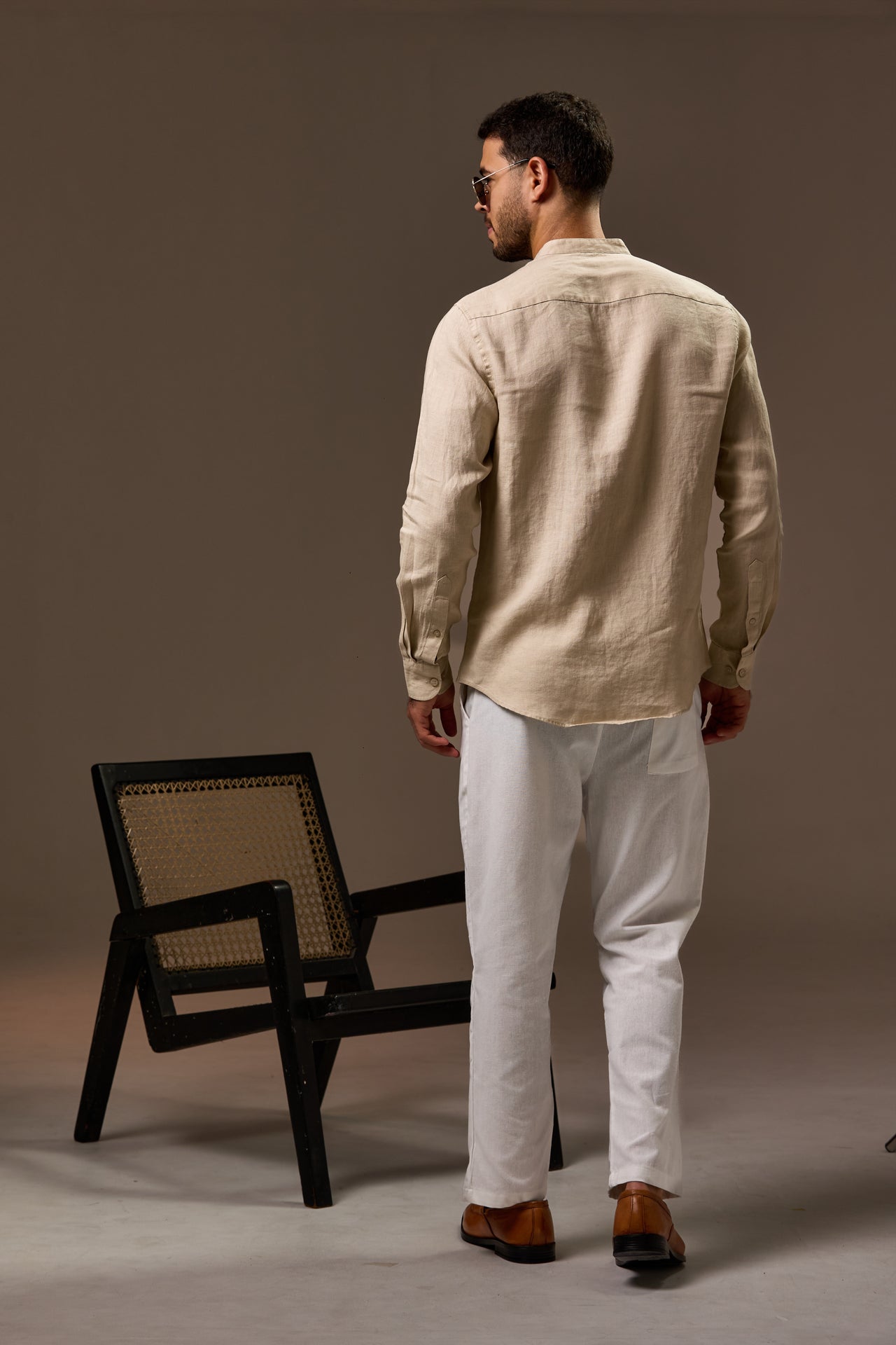 Crafted from natural linen fabric, this shirt features a distinctively textured surface with a light, airy hand feel. The fabric’s open weave allows enhanced breathability while delivering a relaxed drape that softens with wear. Designed to feel cool and comfortable against the skin, it offers effortless movement and a naturally refined look. Finished with clean tailoring and minimal detailing, this linen shirt is ideal for elevated everyday wear and warm-weather styling.