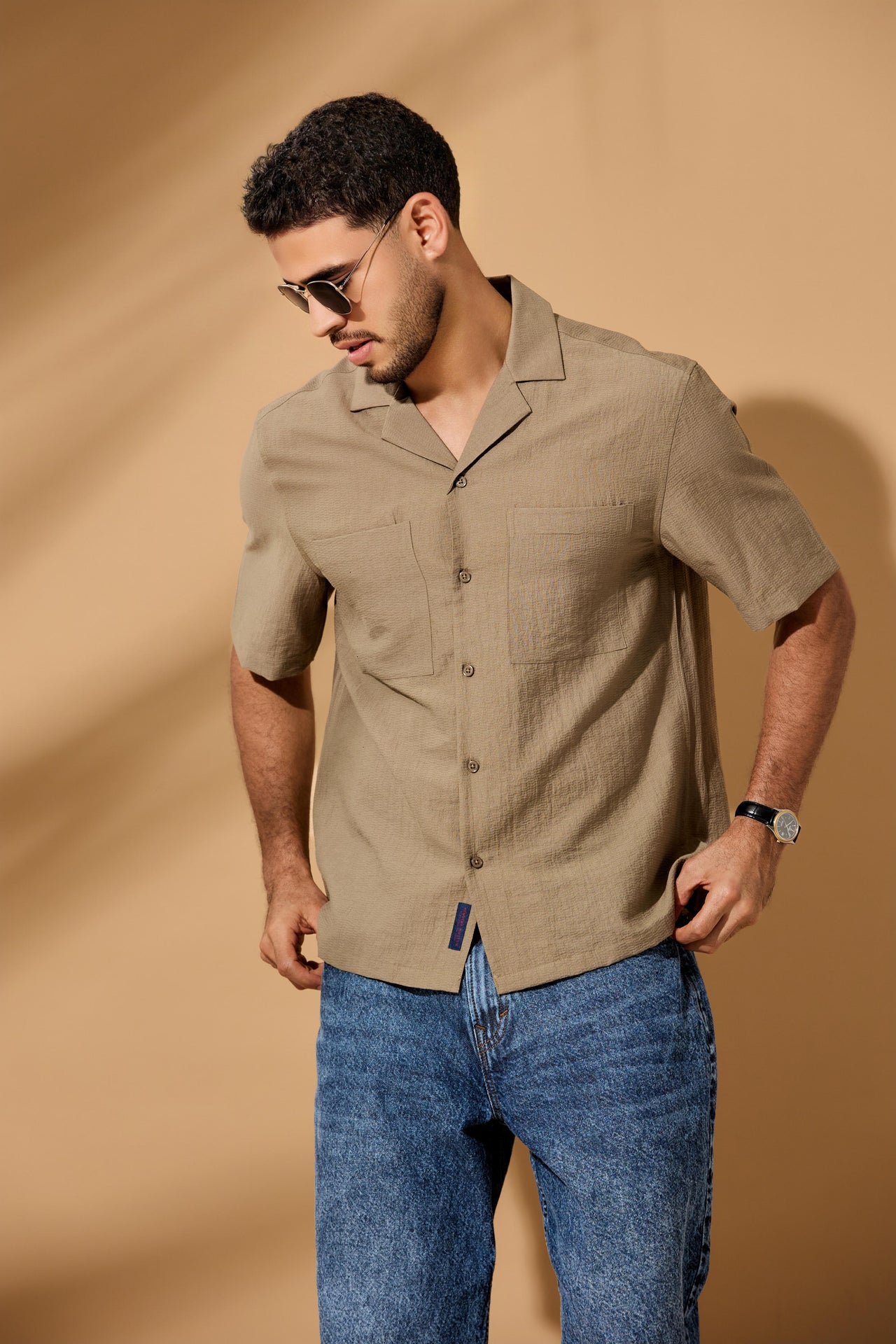 An effortless blend of structure and ease, this short-sleeve shirt is crafted from a lightly textured fabric that offers both breathability and a refined hand feel. The open-collar design, relaxed drape, and subtle surface texture give it an understated sophistication suited for everyday wear or elevated casual moments. Designed with clean tailoring and soft movement, it captures the essence of modern comfort and timeless simplicity.